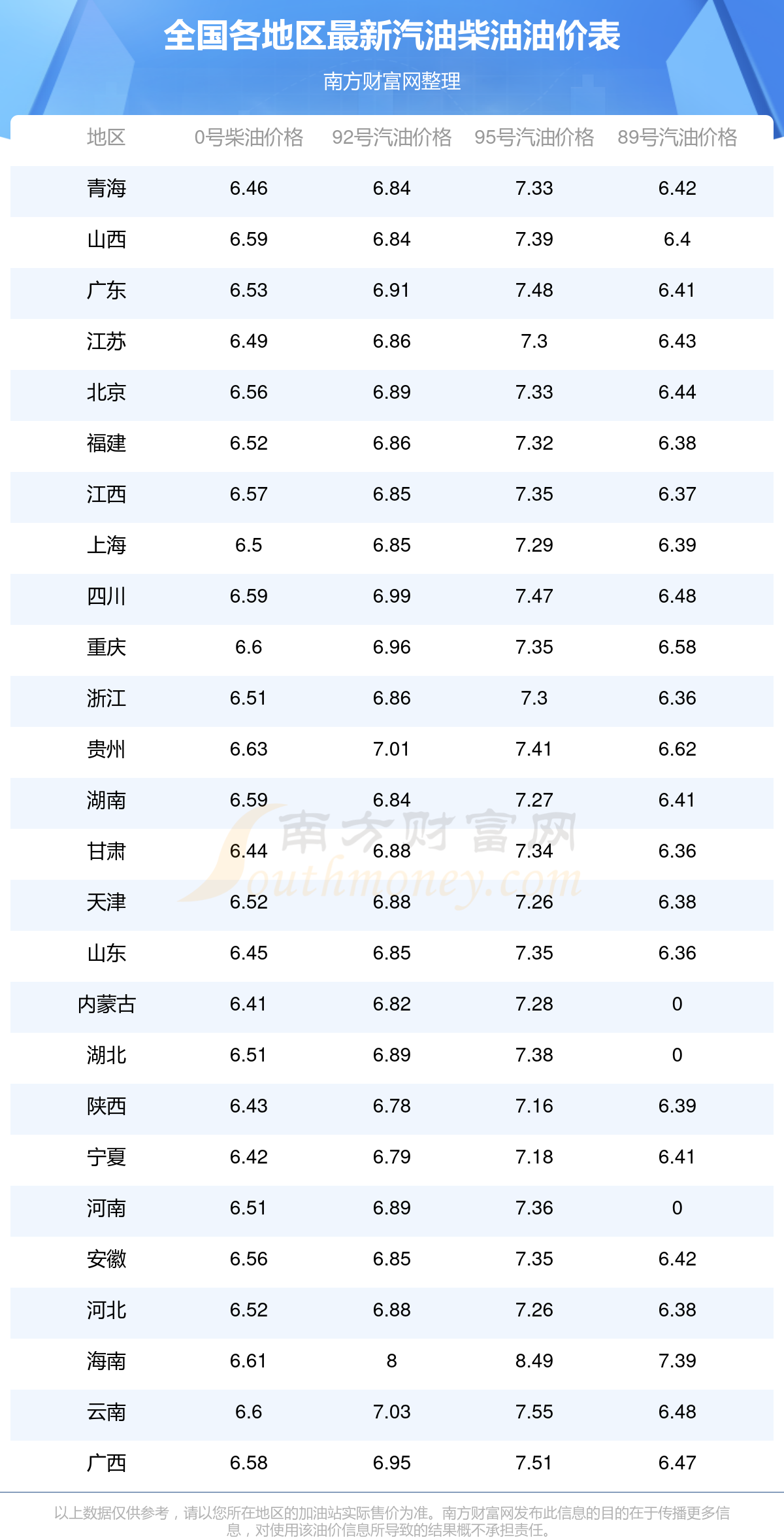 95號汽油平均價格:7元每升,其中,最高為海南,價格8.49元/升,最低為陜西,價格7.16元/升。