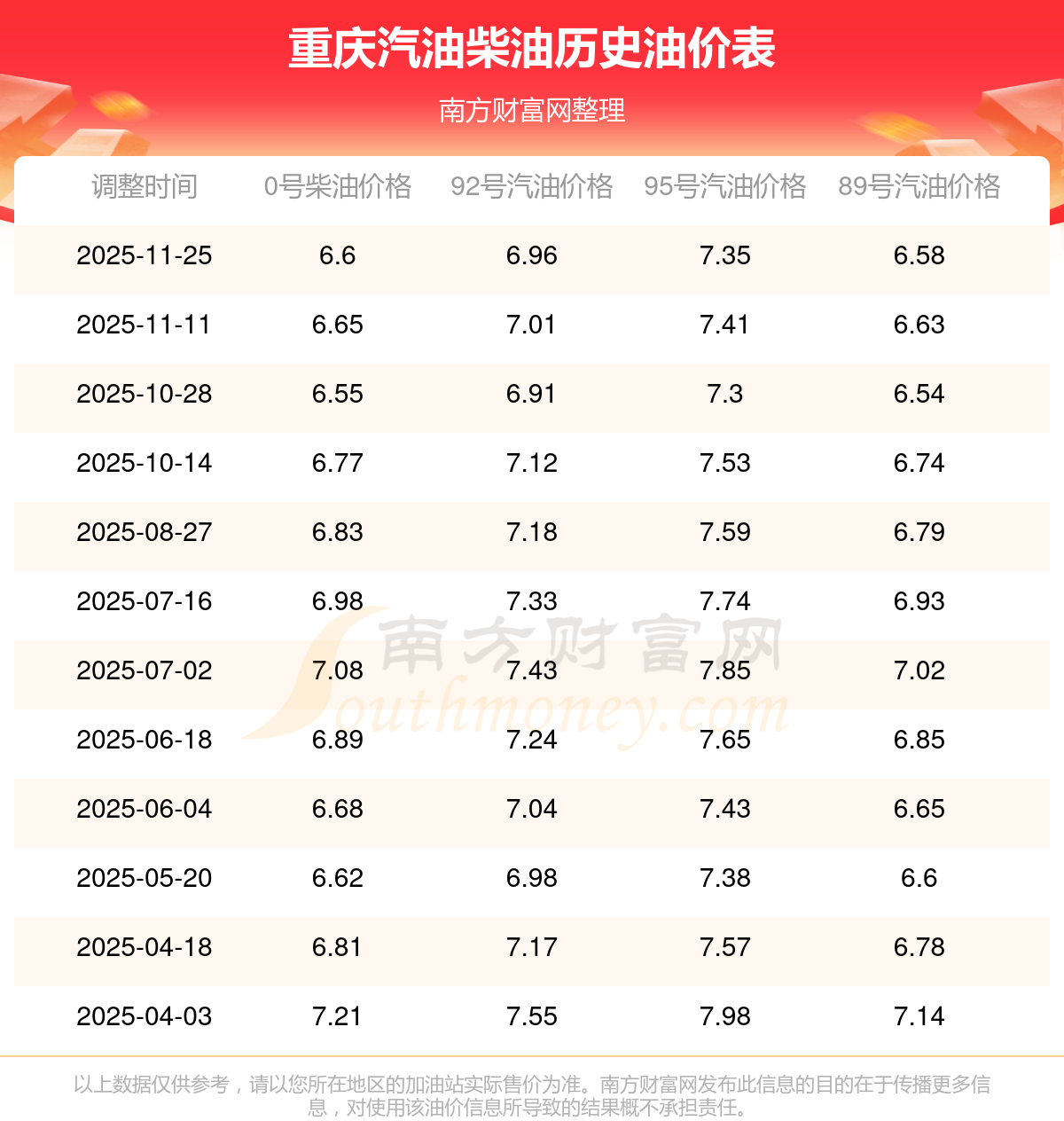 12月2日重慶汽油、柴油每升的價格是11月25日調(diào)整后的價格:92號汽油為6.96元,跌了0.05元,跌幅達(dá)0.71%;95號汽油為7.35元,跌了0.06元,跌幅達(dá)0.81%;89號汽油為6.58元,跌了0.05元,跌幅達(dá)0.75%;0號柴油為6.6元,跌了0.05元,跌幅達(dá)0.75%。