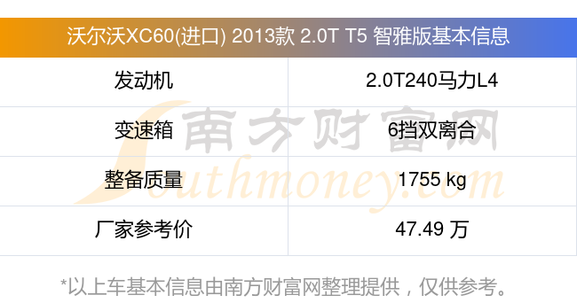 沃爾沃XC60(進(jìn)口) 2013款 2.0T T5 智雅版動(dòng)力上配備的是一臺(tái)2.0T240馬力L4渦輪增壓發(fā)動(dòng)機(jī),匹配的是6擋雙離合自動(dòng)檔變速箱,燃料形式為汽油,常規(guī)整備質(zhì)量1755kg,廠(chǎng)家參考價(jià)47.49萬(wàn)元。