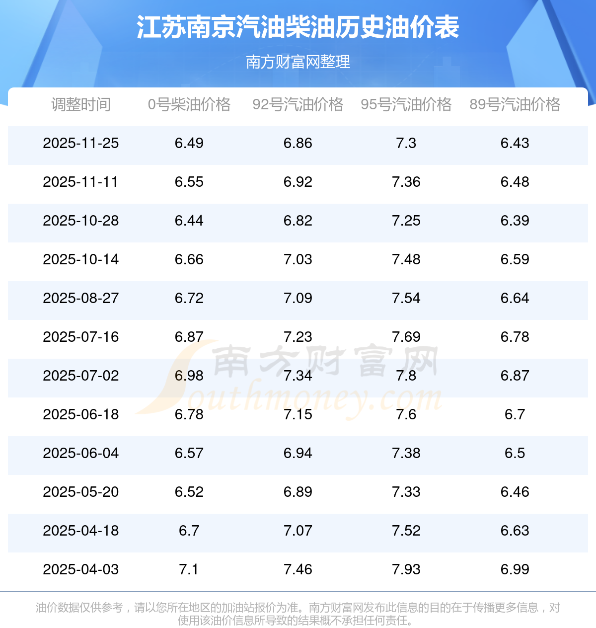 12月2日,江蘇南京汽油、柴油每升最新價格:本輪的油價調(diào)整時間是11月25日,92號汽油為6.86元,減了0.06元,減幅達0.87%;95號汽油為7.3元,減了0.06元,減幅達0.82%;89號汽油為6.43元,減了0.05元,減幅達0.77%;0號柴油為6.49元,減了0.06元,減幅達0.92%。