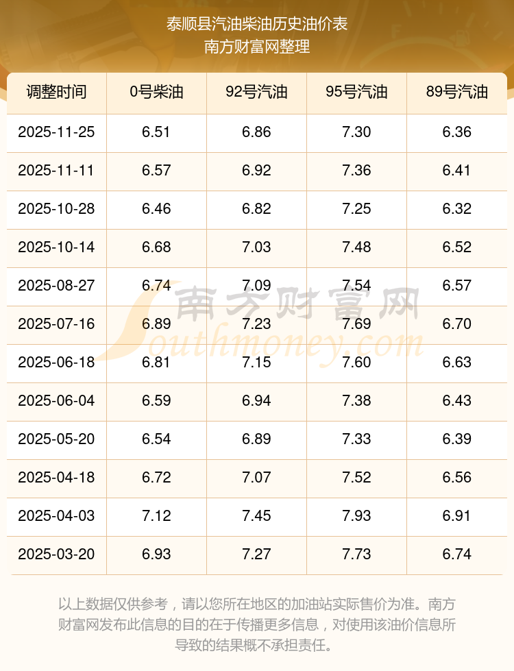 油價(jià)數(shù)據(jù)僅供參考,請(qǐng)以您所在地區(qū)的加油站報(bào)價(jià)為準(zhǔn)。南方財(cái)富網(wǎng)發(fā)布此信息的目的在于傳播更多信息,對(duì)使用該油價(jià)信息所導(dǎo)致的結(jié)果概不承擔(dān)任何責(zé)任。