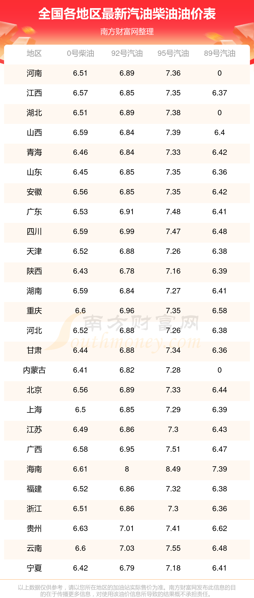 全國89號(hào)汽油平均價(jià)格為:6元每升,其中,最低為浙江,價(jià)格6.36元/升,最高為海南,價(jià)格7.39元/升。