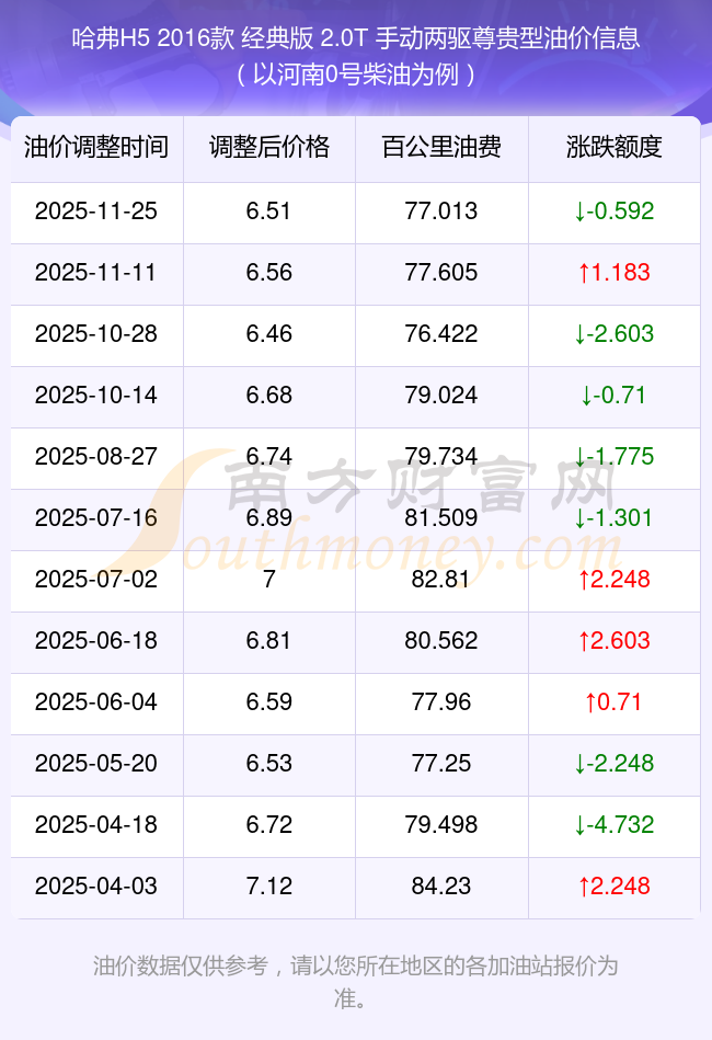 按照11月25日0號(hào)柴油最新調(diào)整價(jià)格6.51元/升來(lái)計(jì)算(以河南為例),該車(chē)型百公里平均油費(fèi)為77.013元,按照上一輪11月11日調(diào)整價(jià)格6.56元/升來(lái)計(jì)算,百公里平均油費(fèi)為77.605元,對(duì)比上一輪少花0.592元,下一輪油價(jià)調(diào)整時(shí)間為12月8日24時(shí)。