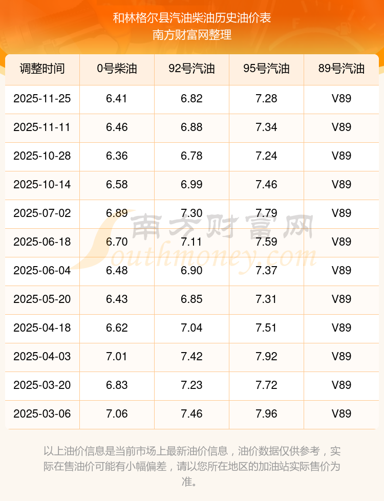 12月2日,和林格爾縣汽油、柴油每升最新價格為(11月25日調(diào)整后的價格):92號汽油為6.82元,跌了0.06元,跌幅達0.87%;95號汽油為7.28元,跌了0.06元,跌幅達0.82%;0號柴油為6.41元,跌了0.05元,跌幅達0.77%。
