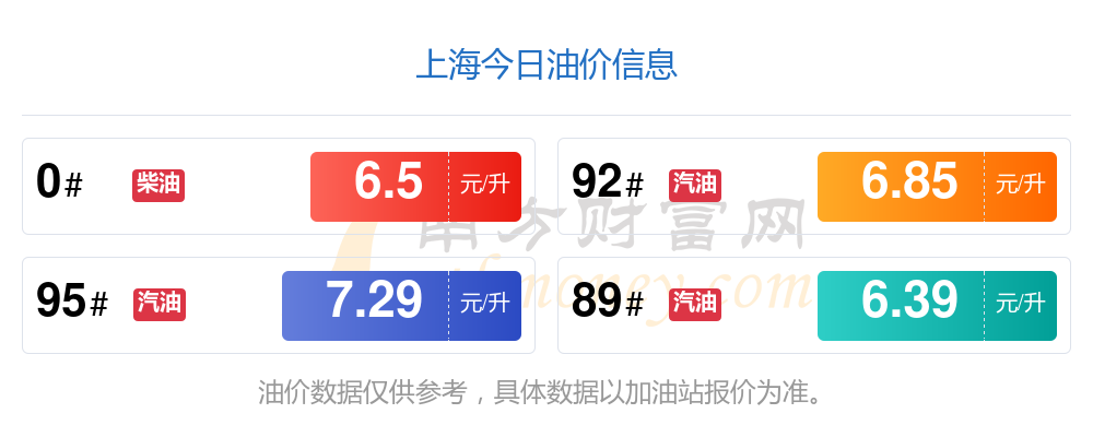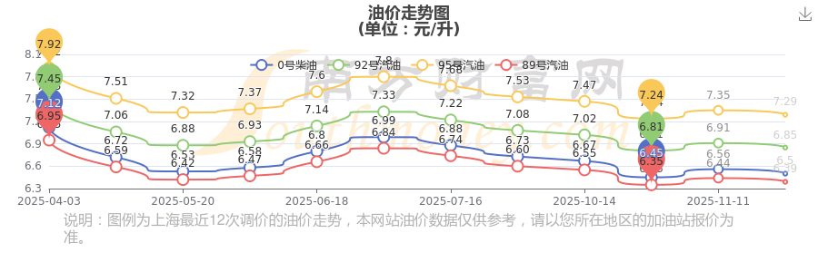 12月2日上海汽油、柴油每升的價格詳情如下:92號汽油6.85元,下降了0.06元;95號汽油7.29元,下降了0.06元;89號汽油6.39元,下降了0.05元;0號柴油6.5元,下降了0.06元,本次油價的調整時間為11月25日。