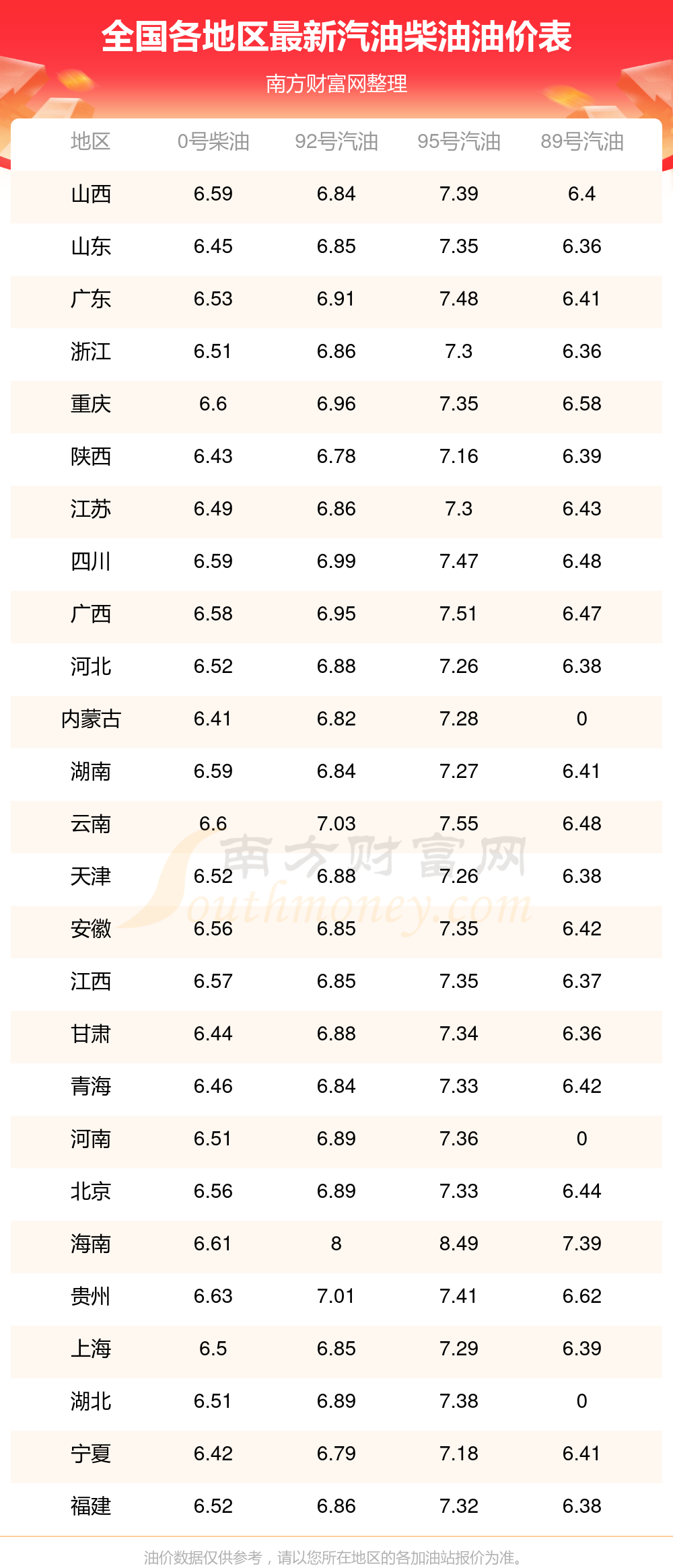 油價最新調(diào)整時間為11月25日,全國92號汽油最新平均價格為:7元每升,其中,最低為陜西,價格為6.78元/升,最高為海南,價格為8.00元/升。全國95號汽油最新平均價格為:7元每升,其中,最低為陜西,價格為7.16元/升,最高為海南,價格為8.49元/升。全國0號柴油最新平均價格為:7元每升,其中,最低為內(nèi)蒙古,價格為6.41元/升,最高為貴州,價格為6.63元/升。全國89號汽油最新平均價格為:6元每升,其中,最低為浙江,價格為6.36元/升,最高為海南,價格為7.39元/升。,下一輪油價調(diào)整時間12月8日24時,距離現(xiàn)在還有6.15天。