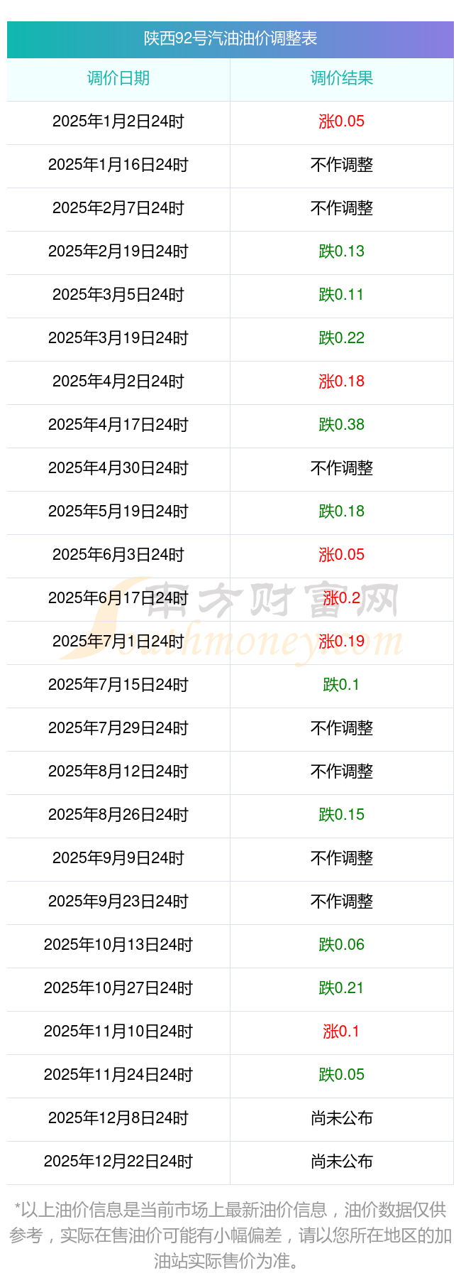 陜西銅川2025年油價調價窗口日期表: