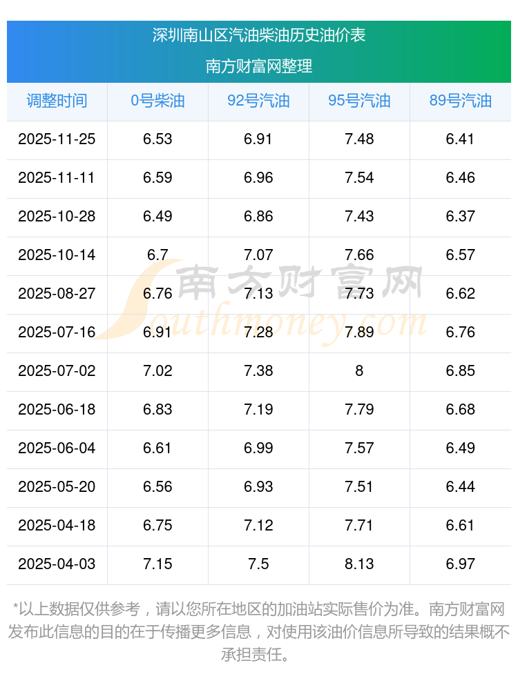 深圳南山區(qū)汽油、柴油12月2日每升的價格(油價調整時間11月25日):92號汽油6.91元;95號汽油7.48元;89號汽油6.41元;0號柴油6.53元。