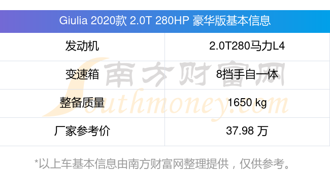 Giulia 2020款 2.0T 280HP 豪華版動力上配備的是一臺2.0T280馬力L4渦輪增壓發(fā)動機,匹配的是8擋手自一體自動檔變速箱,燃料形式為汽油,常規(guī)整備質(zhì)量1650kg,廠家參考價37.98萬元。