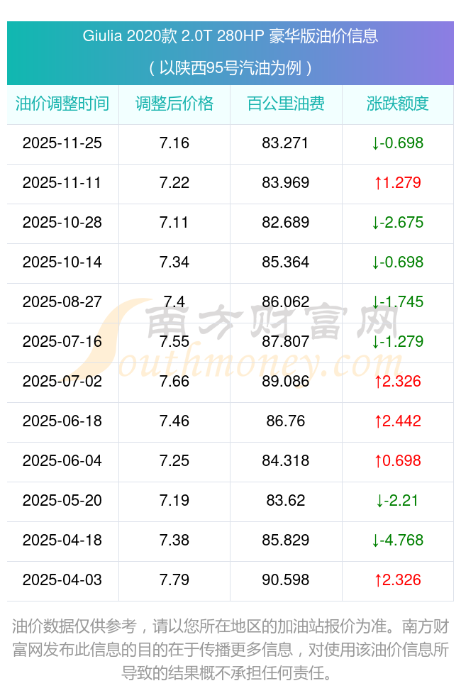 按11月25日95號汽油最新調(diào)整價格7.16元每升來計算(以陜西為例),該車型百公里平均油費為83.271元,按上一輪11月11日調(diào)整價格7.22元每升來計算,百公里平均油費為83.969元,對比上一輪少花0.698元,下一輪油價調(diào)整時間為12月8日24時。