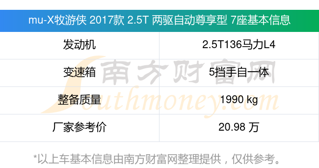 mu-X牧游俠 2017款 2.5T 兩驅(qū)自動尊享型 7座搭載了一臺2.5T136馬力L4渦輪增壓發(fā)動機,采用5擋手自一體自動檔變速箱,常規(guī)整備質(zhì)量1990kg,廠家參考價20.98萬元。