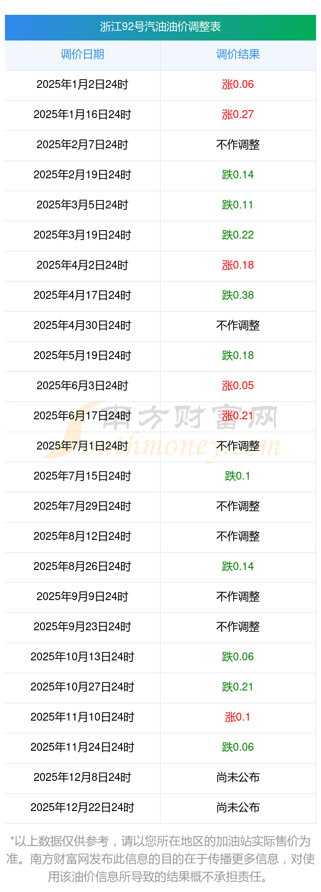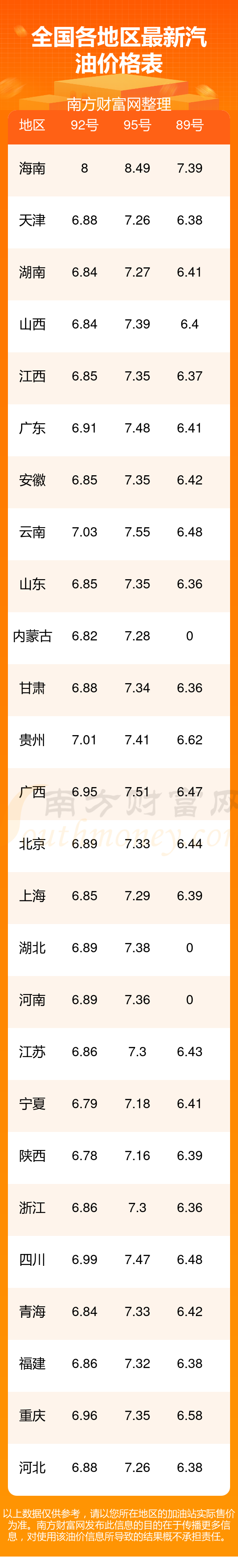 油價數(shù)據(jù)僅供參考,請以您所在地區(qū)的加油站報價為準。南方財富網(wǎng)發(fā)布此信息的目的在于傳播更多信息,對使用該油價信息所導(dǎo)致的結(jié)果概不承擔任何責任。