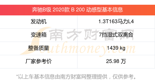 在動(dòng)力上,奔馳B級(jí) 2020款 B 200 動(dòng)感型配備的是一臺(tái)1.3T163馬力L4渦輪增壓發(fā)動(dòng)機(jī),匹配的是7擋濕式雙離合自動(dòng)檔變速箱,燃料形式為汽油,常規(guī)整備質(zhì)量1439kg,廠家參考價(jià)25.98萬元。