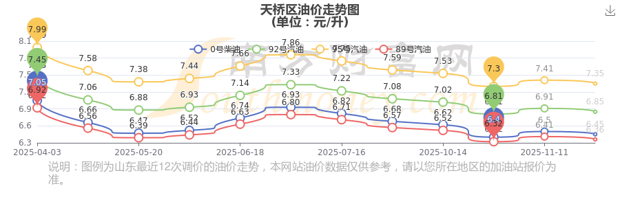 天橋區(qū)汽油、柴油12月2日每升最新價格為:92號汽油為6.85元;95號汽油為7.35元;89號汽油為6.36元;0號柴油為6.45元,調(diào)整時間為11月25日。