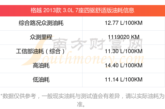 根據(jù)多位車主實(shí)測得出數(shù)據(jù),該車型低油耗為11.14L/100km,高油耗為14.40L/100km,綜合路況眾測油耗為12.77L/100km,工信部綜合油耗為11.30L/100km。