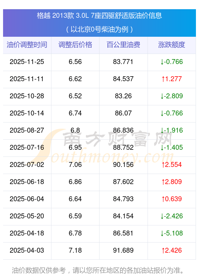 依照11月25日0號柴油最新調(diào)整價(jià)格6.56元/升來計(jì)算(以北京為例),該車型百公里的平均油費(fèi)是83.771元,依照上一輪11月11日調(diào)整價(jià)格6.62元/升來計(jì)算,百公里的平均油費(fèi)是84.537元,對比上一輪少花0.766元,下一輪的油價(jià)調(diào)整時(shí)間12月8日24時(shí)。