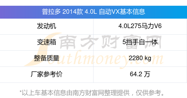 普拉多 2014款 4.0L 自動VX動力方面,搭載的是一臺4.0L275馬力V6自然吸氣發(fā)動機,匹配5擋手自一體自動檔變速箱,燃料形式為汽油,常規(guī)整備質量2280kg,廠家參考價64.2萬元。