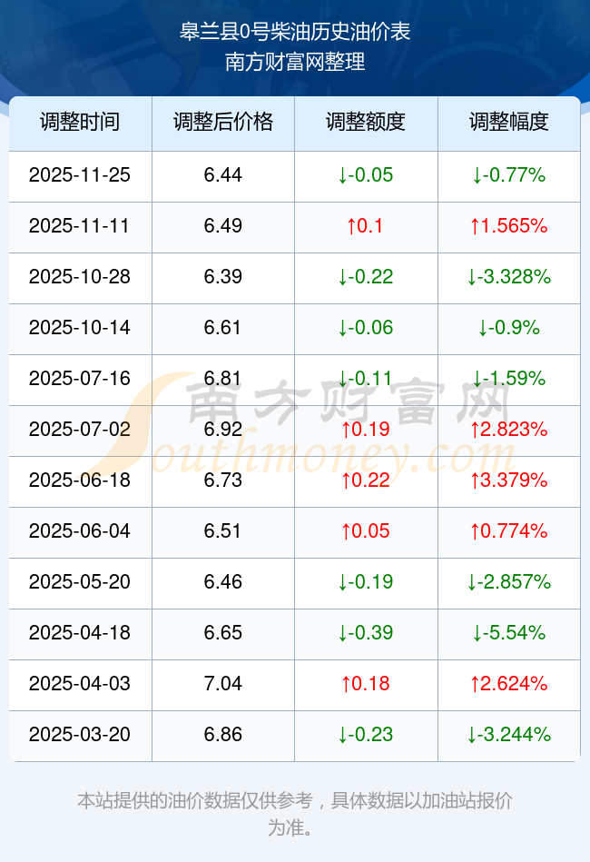 12月2日皋蘭縣0號(hào)柴油歷史油價(jià)一覽表