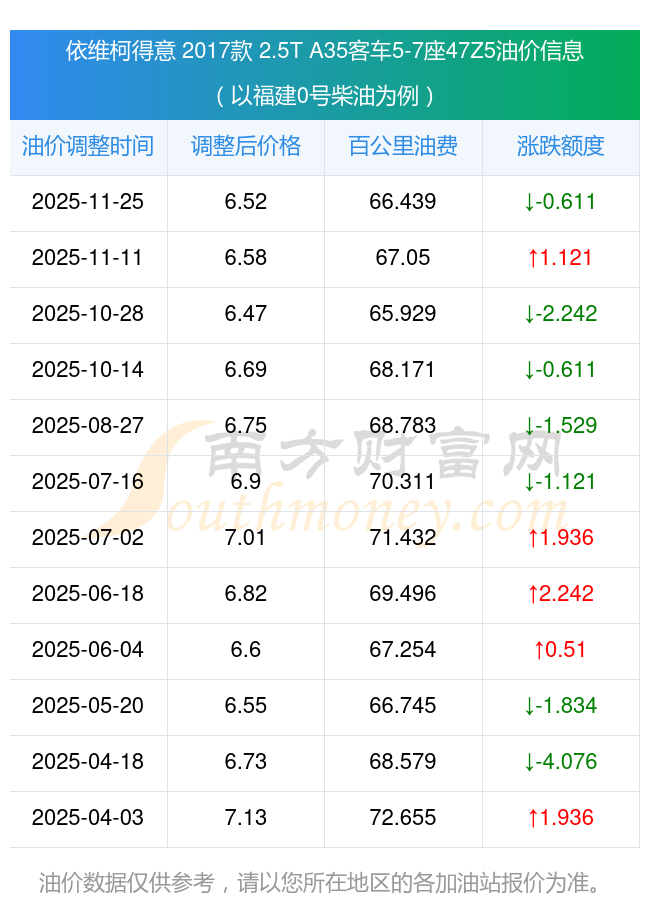 依照11月25日0號柴油最新調(diào)整價格6.52元/升來計算(以福建為例),該車型百公里的平均油費是66.439元,依照上一輪11月11日調(diào)整價格6.58元/升來計算,百公里的平均油費是67.05元,對比上一輪少花0.611元,下一輪的油價調(diào)整時間12月8日24時。
