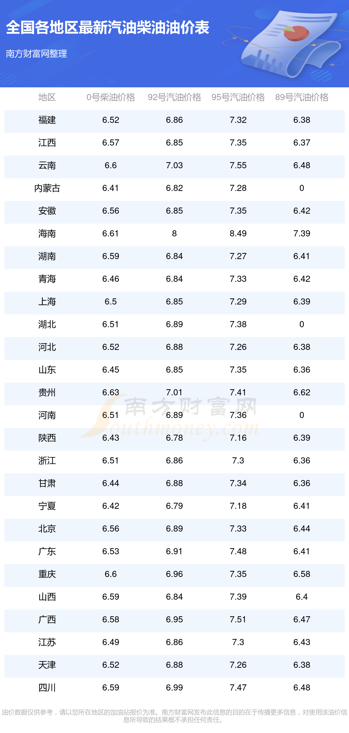 全國89號汽油平均價格為:6元每升,其中,最低為浙江,價格6.36元/升,最高為海南,價格7.39元/升。