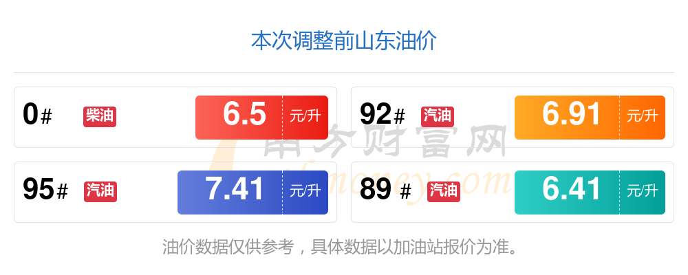 油價(jià)數(shù)據(jù)僅供參考,請(qǐng)以您所在地區(qū)的加油站報(bào)價(jià)為準(zhǔn)。南方財(cái)富網(wǎng)發(fā)布此信息的目的在于傳播更多信息,對(duì)使用該油價(jià)信息所導(dǎo)致的結(jié)果概不承擔(dān)任何責(zé)任。