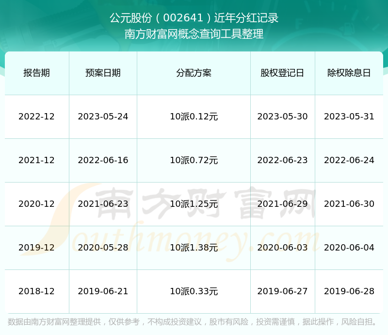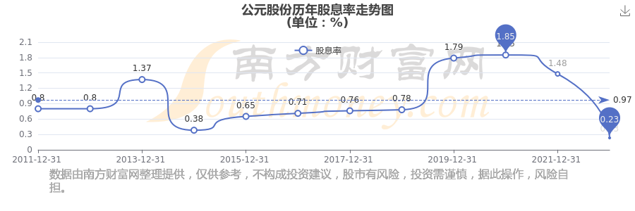 公元股份最新一次公布的分紅方案為10派0.12元。本次權(quán)益分派股權(quán)登記日為2023年5月30日,除權(quán)除息日為2023年5月31日,派息日為2023年5月31日。